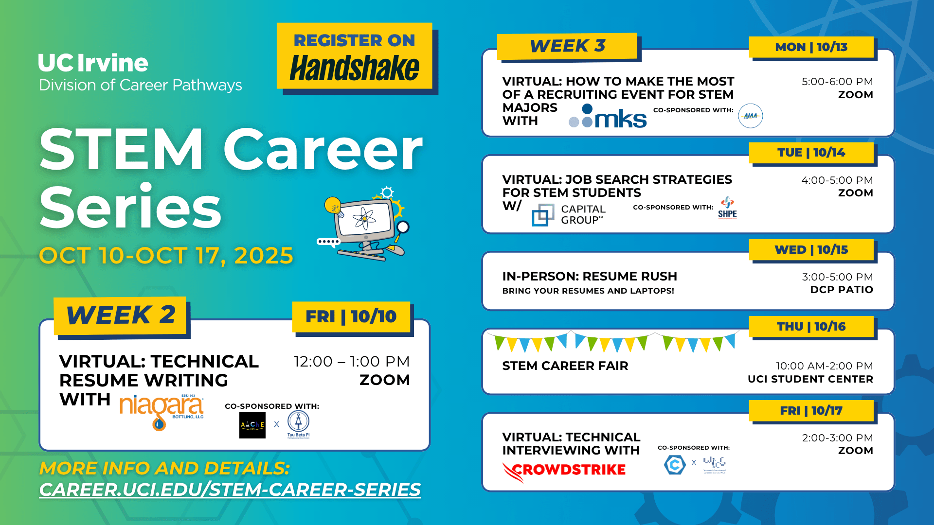 Whether you're exploring your career options or gearing up for the STEM Career Fair on October 16, this series is designed to help you succeed. Attend these workshops to refine your resume, practice your pitch, and prepare for technical interviews. This is your chance to connect with recruiters, get expert advice, and build the skills you need to land your next career opportunity in STEM.